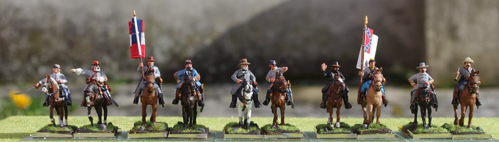 L'état-major au complet du général Lee armée confédérée de Virginie du nord. Les socles ne sont pas encore terminés pour le moment et ma priorité est le diorama sur la bataille de Reims. Pour la guerre de sécession le futur projet est le 39ème bataillon de cavalerie de Virginie l'escorte du général Lee avec ces quatre compagnies et le commandement si vous avez des informations sur les uniformes cela m'intéresse. L'ensemble sera composé de cinq figurines pour le commandement et sept figurines par compagnies, et ensuite on terminé l'ensemble complet de l'état-major par la logistique avec les chariots et l'ambulance. A bientôt Christian.